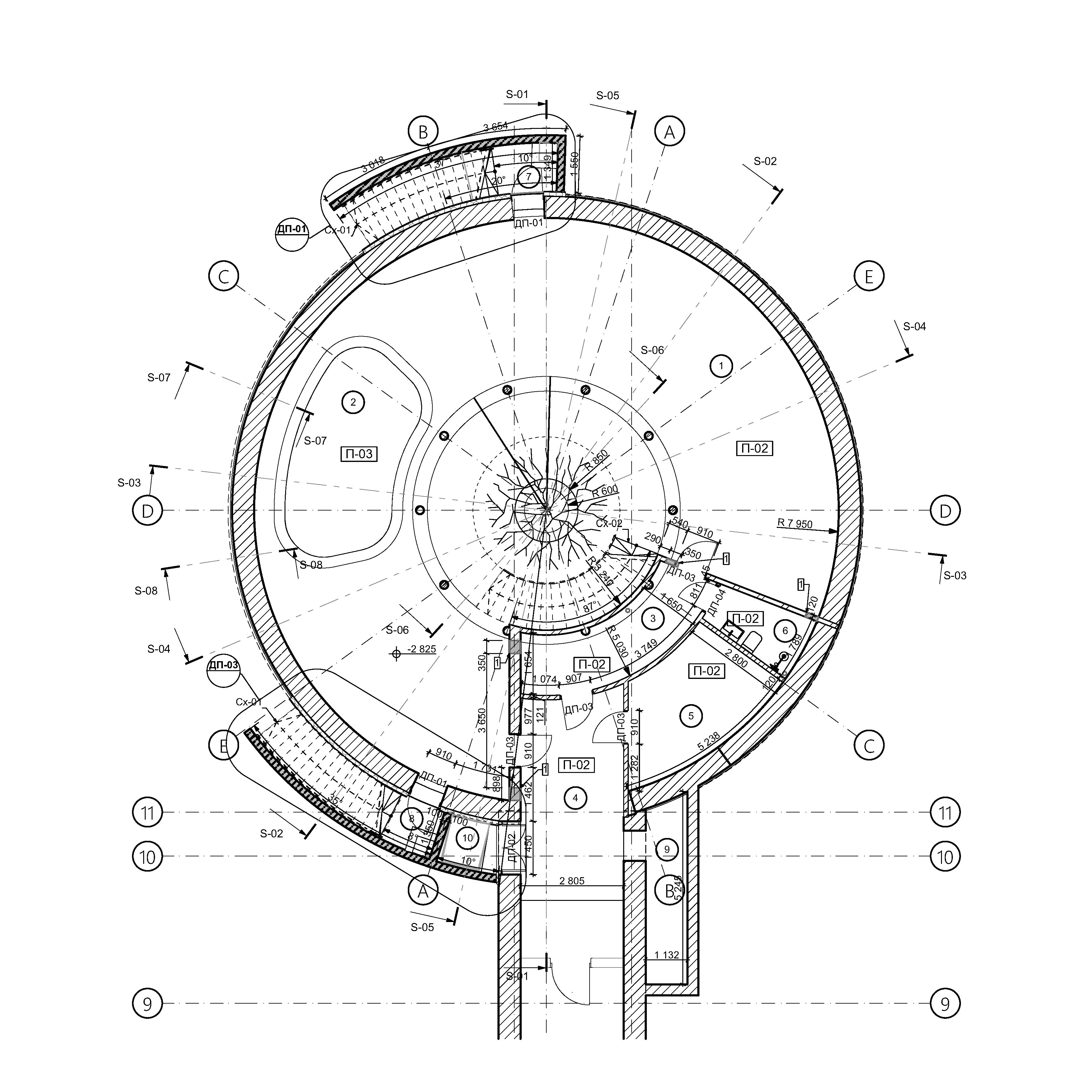 Не часто випадає нагода працювати повністю круглими в плані будівлями. Безперечно, найскладнішим моментом є прив’язка на майданчику до вісей розставлених з радіусним інтервалом.